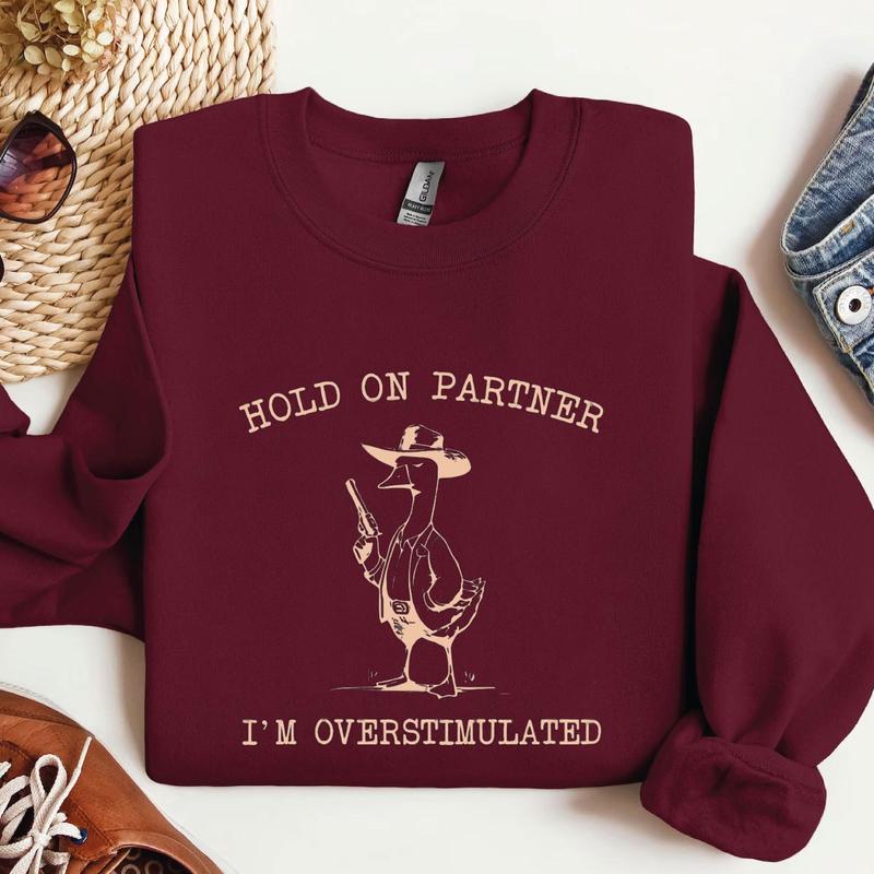 Hold On Partner I'm Overstimulated Cowboy Goose Sweatshirt, Funny Cowboy, Weirdcore, Funny Meme, Funny Western Sweatshirt Unisex Classic Fabric