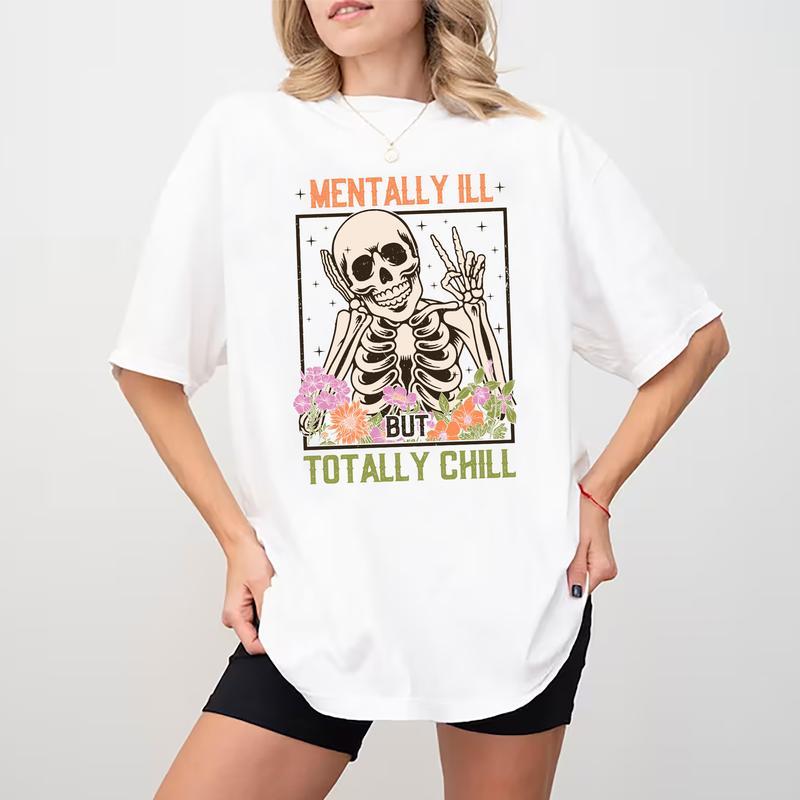 Mentally Ill But Totally Chill Shirt, Funny Mental Health Tee, Floral Skeleton Graphic Printed Short Sleeve Tee Shirt, Cotton Fabric Comforts Shirt Fo