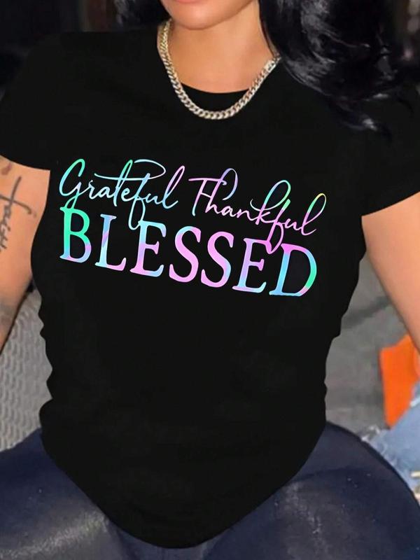 Women's Letter Print Round Neck Short Sleeve Tee, Fashion Casual Crew Neck T-Shirt for Daily Holiday Vacation Outdoor Wear, Ladies Clothes for All Seasons